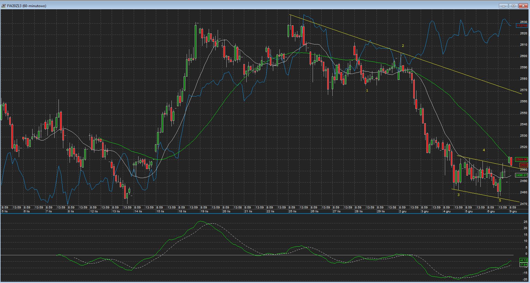 NIby jest wybitka (na wykresie fut 1h) i powinniśmy zrobić jakąś większą korekcinkę- stawiam na dużą 4 przed ostatnim zejściem na wsparcie ale nie wygląda to jakoś cudownie jak na grudzień i mikołaja. Zejście w dół pewnie znów da męczącego boczniaka.
