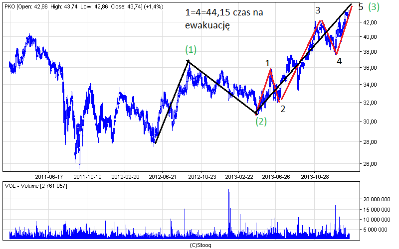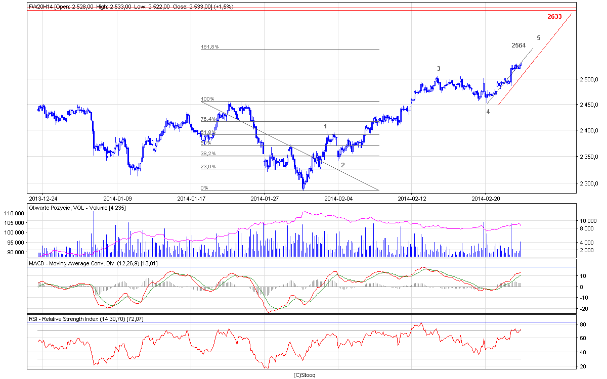 Korekcyjne 2 i 4 były równe. Jeśli 5 = 1 to przed nami ruch 111 pkt czyli do zrobienia 2564 pkt na fw – co ciekawe mamy tam również fibo 161,8 z ostatniego zejścia sprzed obecnej lutowej hossy. Alternatywą jest 5= 1,618 fali 1 (na czerwono) co daje zasięg 2633 pkt czyli w bliskich okolicach listopadowych szczytów 2641 i 2648 pkt (dwie czerwone poziome).