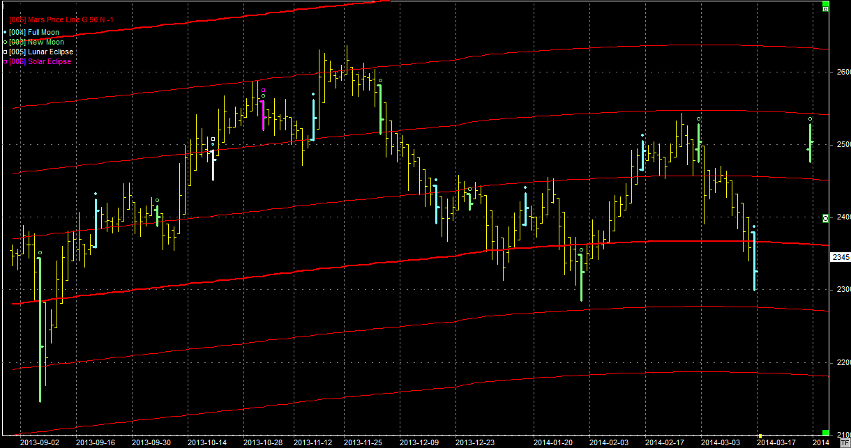 Na wykresie z liniami Marsa zbliżamy się do poziomu wsparcia na linii położonej w okolicach 2280 pkt. Dojście tam powinno wyczerpać, przynajmniej krótkoterminowo, potencjał spadkowy. Oczekuję więc odbicia najdalej we wtorek. Wspiera taki ogląd sobotnia pełnia, która jest elementem zwrotnym. Jeżeli odbicie się pojawi to pierwszy opór znajduje się na linii Marsa w okolicach 2370 pkt. Następny w okolicach 2450 pkt. Najpierw jednak byki muszą uporać się z pierwszym, co nie jest wcale oczywiste.