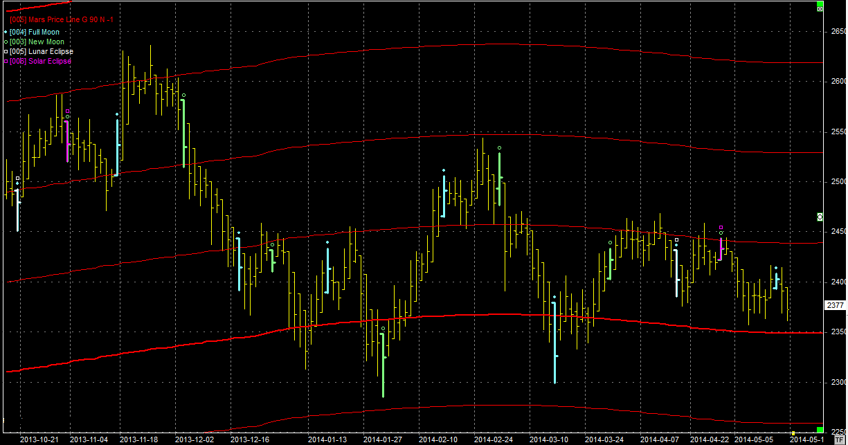 Na wykresie z liniami Marsa ostatnia pełnia nie wyznaczyła dołka, ale krótkoterminową górkę. Nadal uważam, że testowanie wsparcia na poziomie 2350 pkt jest najbardziej prawdopodobnym scenariuszem. Niedźwiedzie muszą się jednak spieszyć bowiem 20 maja Mars powraca do ruchu prostego, co historycznie pomagało bykom.