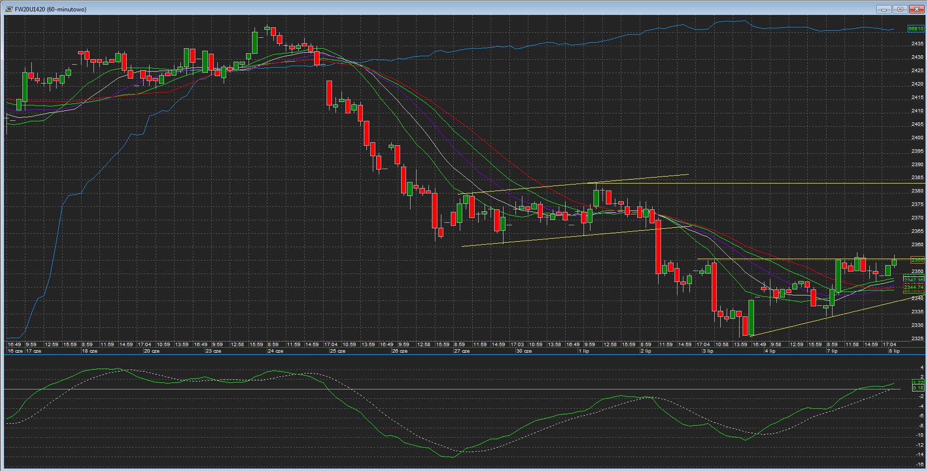Jeśli tym razem opcja zatrzymania i odreagowania miałaby się zmaterializować należy wyjść górą z obecnej konsolidacji - na wykresie fut 1h.