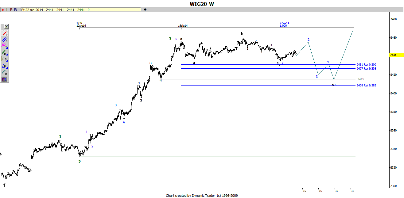 Zejście poniżej 2400(dla wiga20) kasuje wersje, że gramy fale 4. Inny wariant to już rozpoczęta fala 5 lub zaproponowany wcześniej trójkąt jako fala 4. Pewne odpowiedzi powinny paść już w poniedziałek.