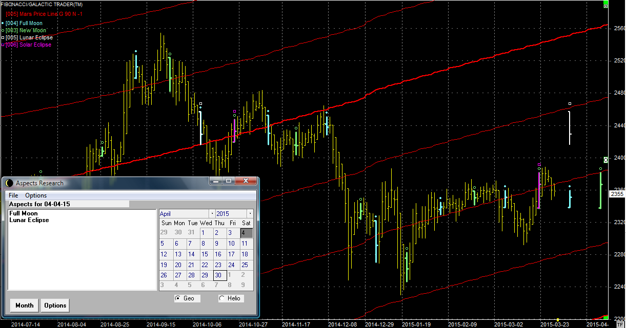 Na wykresie z liniami Marsa ostatni nów i zaćmienie Słońca działają jak punkt zwrotny i kurs notuje niższe poziomy od tego czasu. Problemem jest również powrót pod przełamany niedawno opór. To może wyzwolić podaż u zawiedzionych byków. Jeżeli tak się stanie to następne wsparcie mamy na poziomie 2280 pkt. W przyszłą sobotę mamy pełnię na zaćmieniu Księżyca, a więc układ odwrotny do ostatniego. Oba te zjawiska działają jako punkty zwrotne. Możliwe więc. że dopiero z końcem tygodnia ustanowimy dołek.