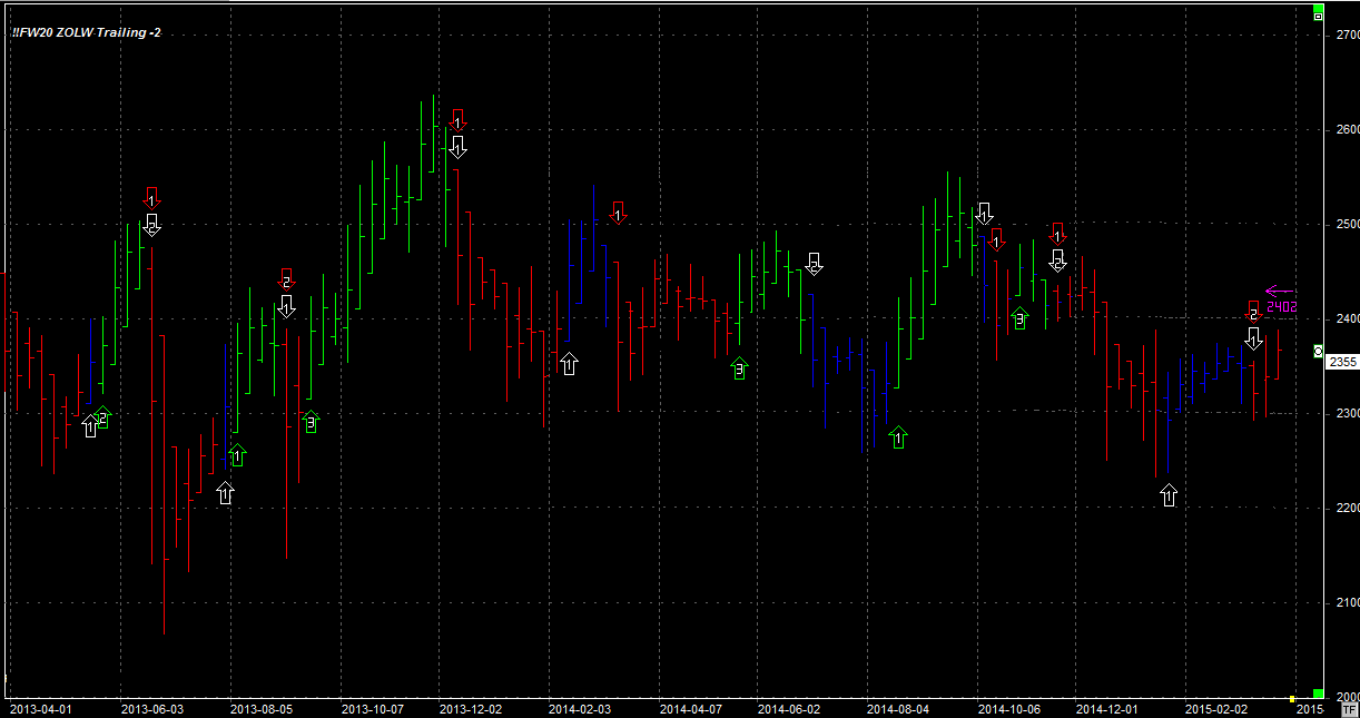 System utrzymuje dwie krótkie pozycje (zgodnie ze zdefiniowanym trendem) po 2300 pkt. Stop na poziomie 2402 pkt.