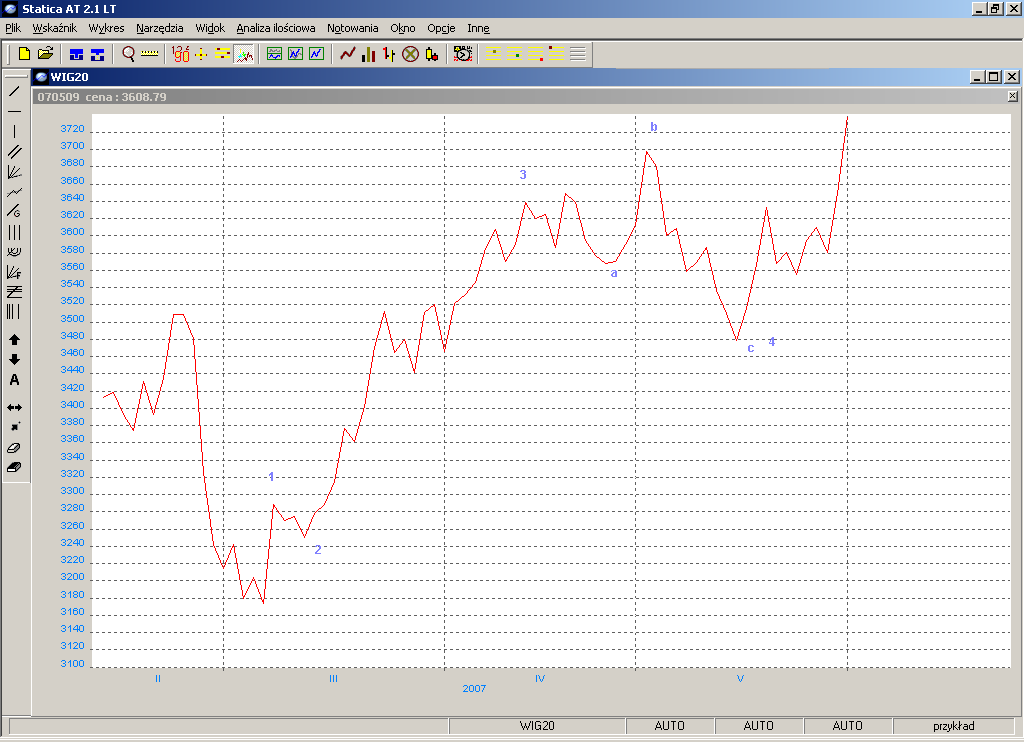 Przypuszczaj?c i kombinuj?c falki oznaczy?em tak jak ni?ej patrz?c po Âwiecowym skoro zak?adam ?e 3 jest wyd?u?ona to 1=200 to 5=200x1,618=323 to znaczy ?e dodaj?c do 3480+ 323= 3803 - wychodzi koniec fali pi?tej(w przybli?eniach oczywiÂcie)