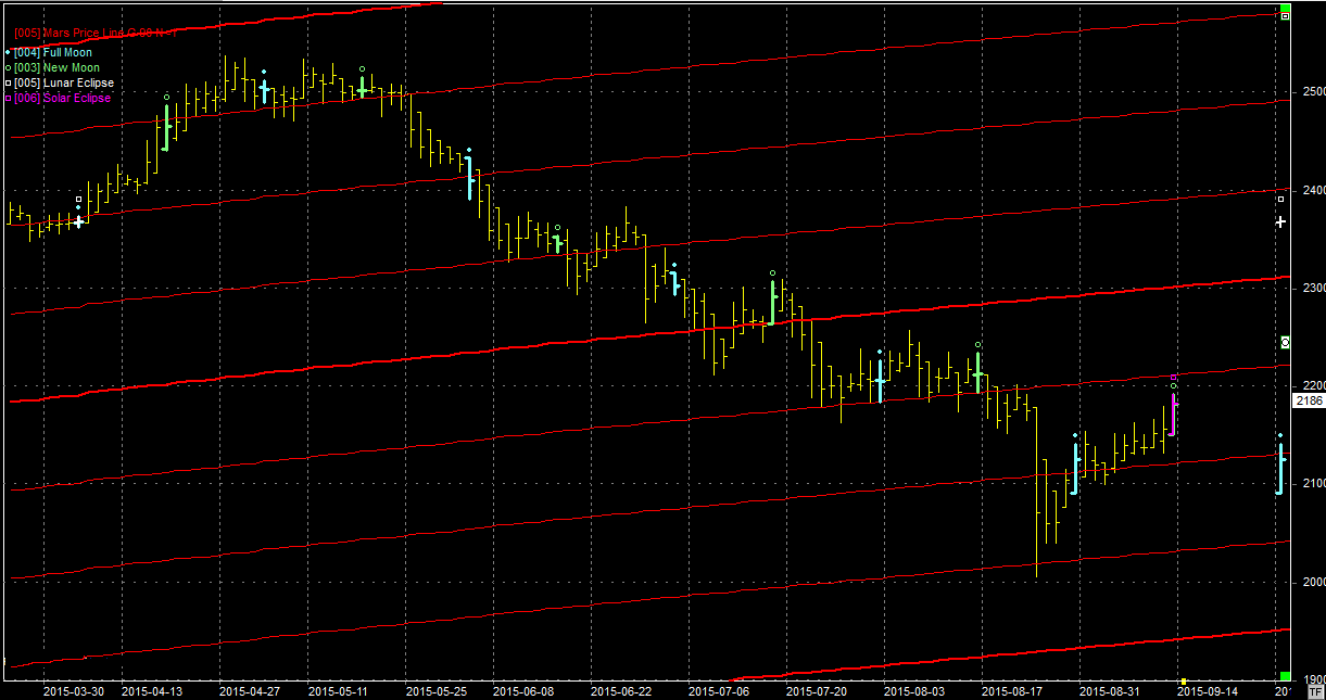 Na wykresie z liniami Marsa dotarliśmy do zapowiadanego oporu na poziomie 2200 pkt. Mamy nów na zaćmieniu. Powinniśmy zawracać. Pierwsze wsparcie jest na poziomie 2140 pkt. Niżej na poziomie 2040 pkt.