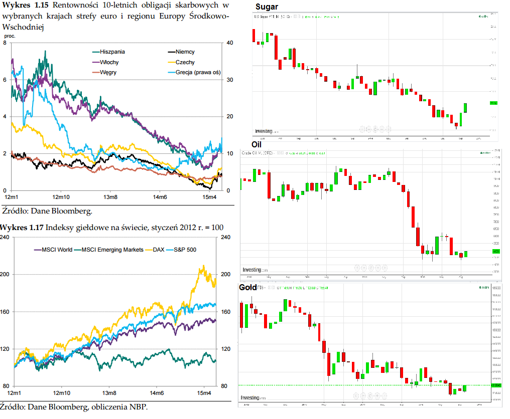 Zwróćcie szczególną uwagę na wykres pierwszy i rentowność niemieckich obligacji oraz wartości indeksów... Wygląda mi to na dno i moim zdaniem następuje właśnie w skali globalnej odpływ kapitału z obligacji i akcji w pozostała aktywa - produkty i surowce, złoto i metale szlachetne oraz nieruchomości (tak dla odmiany, bo wszędzie piszą, że bessa na surowcach może potrwać z 5 lat i coś mi to przypomina zapowiedzi z 2008r jak trąbili, że ropa będzie po 200 $ za baryłkę).