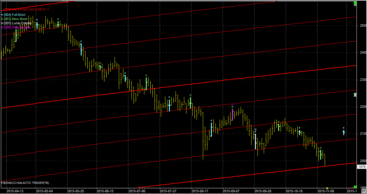 Na wykresie z liniami Marsa dotarliśmy do wsparcia na poziomie 1980 pkt. Zamknięcie o 1 pkt. niżej na razie niczego nie zmienia. Niestety zejście na nowe minima dokonało się 2 dni po nowiu i teraz już trudno liczyć na działanie tego elementu zwrotnego. Musi wystarczyć samo wsparcie, które może prowokować do odbicia. Niestety widzę też możliwość nakręcenia spirali spadków, dla których paliwem będzie strach i emocje, zwłaszcza po ostatnich wydarzeniach w Paryżu. Niestety kolejna linia wsparcia przebiega dopiero w okolicach 1900 pkt. Początek tygodnia będzie więc kluczowy dla utrzymania obecnego wsparcia. Jeżeli pęknie to indeks zamieni się w spadający kamień.