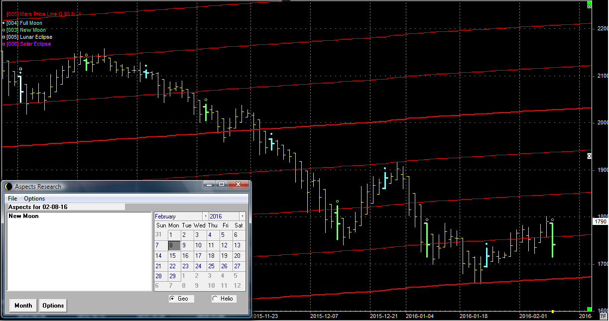 Na wykresie z liniami Marsa mamy mały problem z poniedziałkowym nowiem, który jest elementem zwrotnym. Pisałem o tym ostatnio, ze dobrze byłoby gdyby byki poczekały z łamaniem oporów do okresu po nowiu. Wtedy byłby dłuższy czas na dalszą wspinaczkę. A tak? Niestety w poniedziałek możemy zobaczyć negację całej świecy dziennej, która jest nad oporem na poziomie 1770 pkt. Byku muszą pilnować tego poziomu bo powrót pod niego oznaczać będzie fałszywe wybicie i gwałtowny wzrost podaży. Jeżeli się uda utrzymać ten poziom w poniedziałek to następne dni powinny być bycze. Następny opór jest na poziomie ok 1850 pkt.