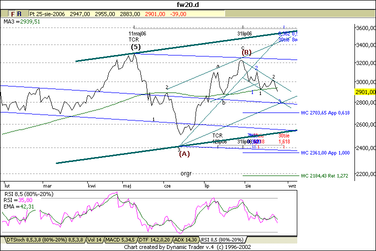 Propozycja nr fal sugeruje [podobnie jak przy kgh] 3w:Cw. Na wykresie cen close dokladnie widac kanal spadkowy. Cena close przebila 100sesyjna, ktora jak widac poprzednio ladnie dzialala jako wsparcia i opory. Czasowki dolkow [1,618] i gorek [0,362] sugeruja 30 sierpnia, jako obszar mozliwego pp.