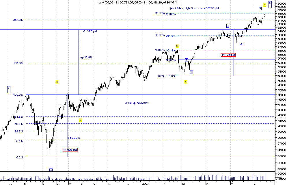 moje poprzednie zalozenie, ze po prawie 33% wzrostu w fali 1 zoltej i tyle samo fali 3ciej zoltej wystarczy dla fali 5tej zoltej 23,6% sie wywrocilo (wtedy 5-ta zakonczylaby sie na poczatku maja), rysunek z maja: http://www.mieszkaniowy.nazwa.pl/olab/f ... ight=#2763