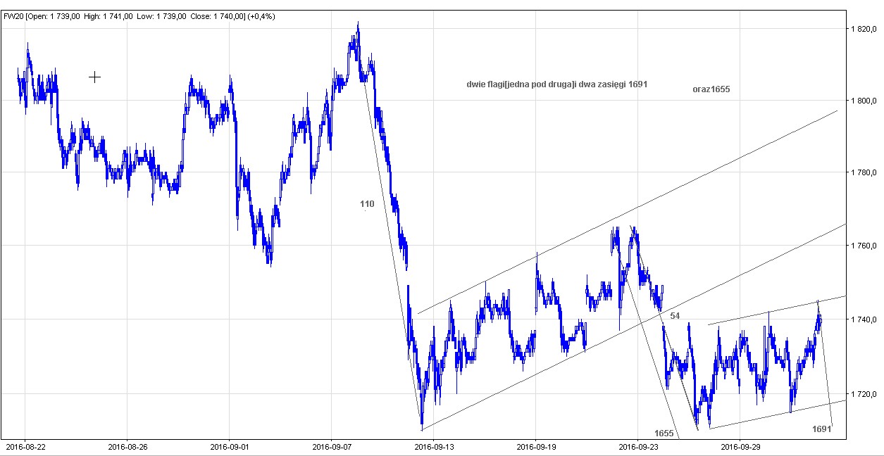 Od dłuższego czasu w kanale (na czarno) , tym razem spadkowym. Od krótszego czasu w ruchu horyzontalnym (na czerwono) z którego wyjście powinno określić kierunek na dłużej. Założenia są takie że przekopanie 40 to 65 a 10 to test kluczowego poziomu 1660-70.