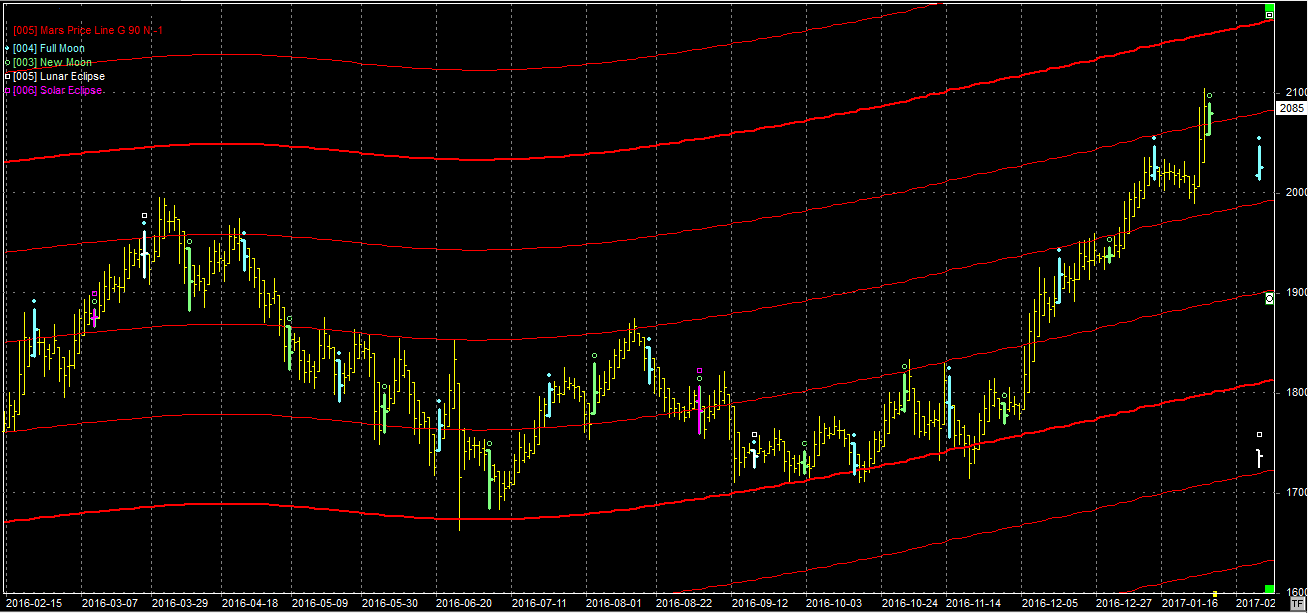 Na wykresie z liniami Marsa nic się nie zmieniło. Kurs utknął w boczniaku bez żadnego odejścia. Może to wskazywać na chęć dalszych wzrostów i ponowny atak na opór na linii położonej obecnie na poziomie 2080 pkt. Nów uściśla się 28.01, więc czasu na podejście trochę jest.