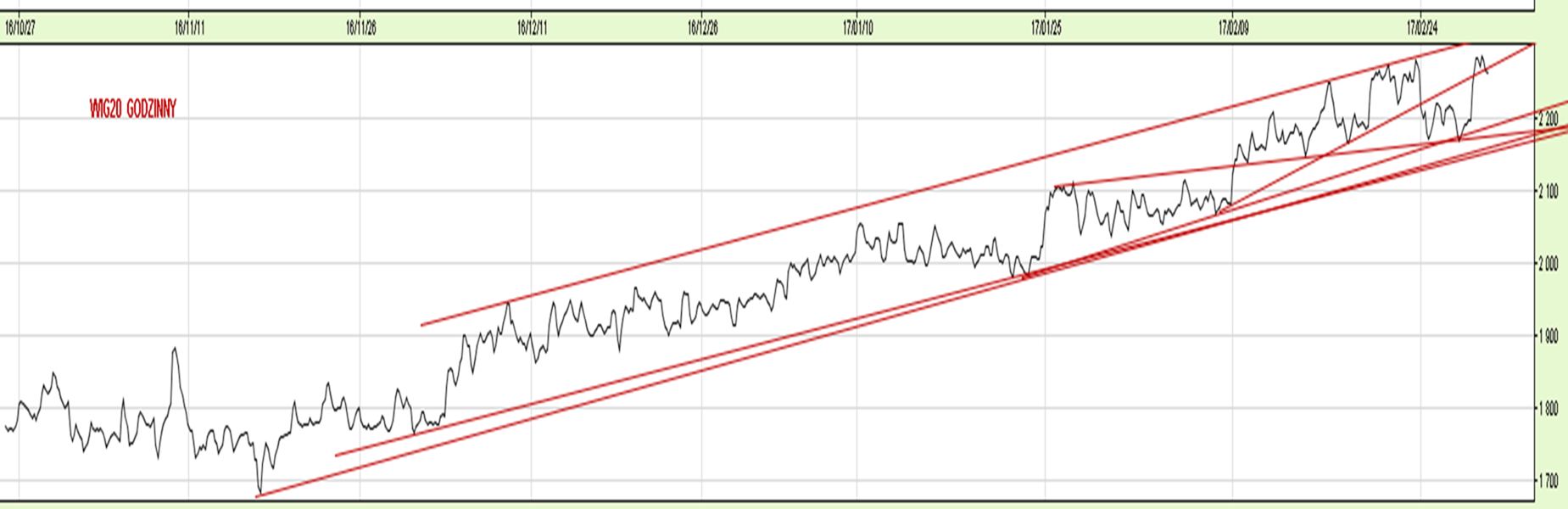 WIG20 godzinny - hossa w pełni z korektami od bandy do bandy, S poważniejsze po wyjściu z kanału dołem;