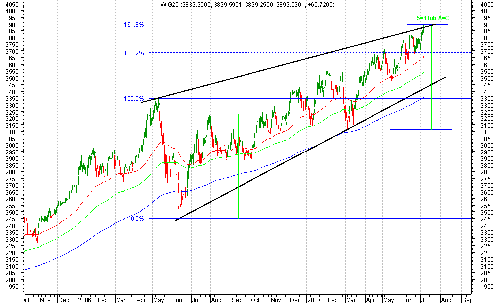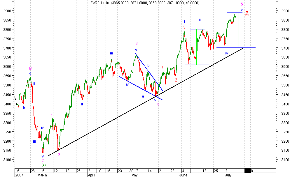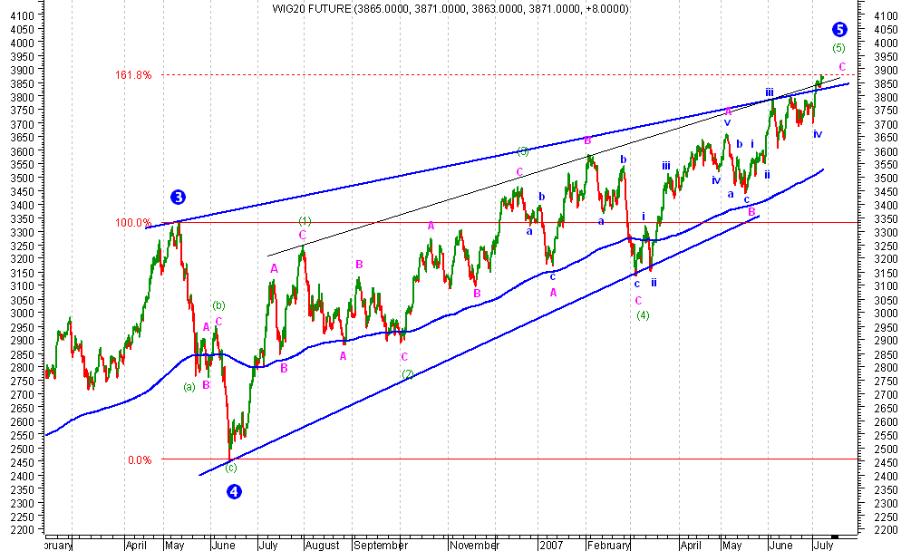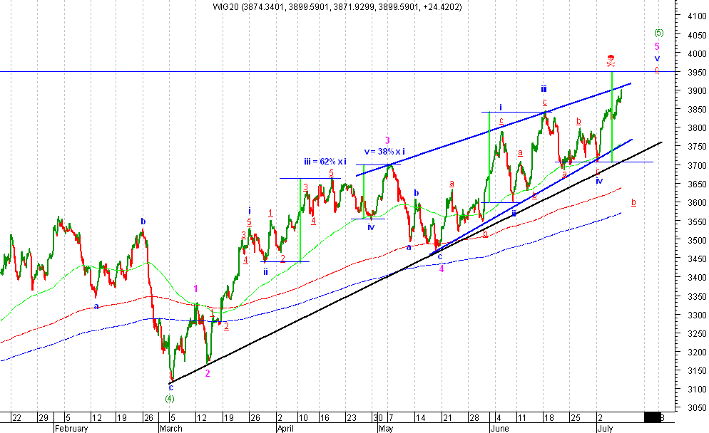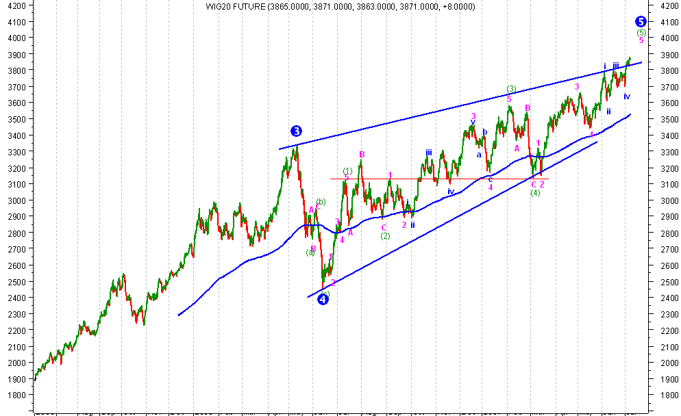 WykreÂliliÂmy prognozowane 2 tyg. temu podejÂcie i idea klina wydaje siŕ materializowaŠ. Widzŕ jednak zagro?enie dla tej koncepcji, mianowicie wyjÂcie ponad 3950 spowoduje ze fala iii w klinie bŕdzie najkrˇtsza a to jest niedopuszczalne. Martwiŕ siŕ trochŕ na zapas bo wcale nie musimy przekroczyŠ tego poziomu ale patrz?c na inne rynki jest jeszcze trochŕ miejsca i czasu na podci?ganie indeksu. Na razie zostawiam oznaczenia bez zmian. W razie zanegowania poka?e now? propozycjŕ w komentarzach po sesji na stronie kana?u #futures. Sygna?em do szorcenia w d?u?szym terminie bŕdzie zejÂcie indeksu poni?ej fali iv.