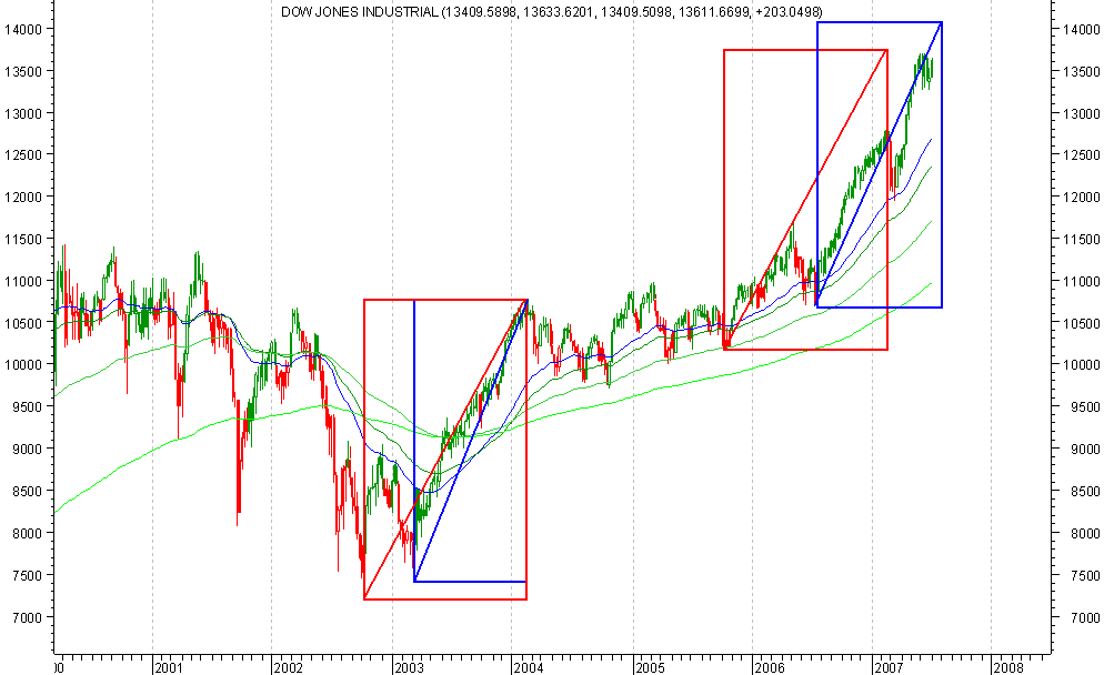 Czerwony kwadrat wyznacza falŕ A od do?ka w 2002 a wiŕc zgodnie pogl?dami Prechtera. Zgodnie z nimi ostrzega? on w swoich raportach o zako˝czeniu fali C na pocz?tku marca br na podstawie czasowych rˇwnosci fal. Owszem by? kilkusetpunktowy zjazd ale z pewnoÂcia nie by? to koniec fali C (wy?szy czerwony prostok?t).
