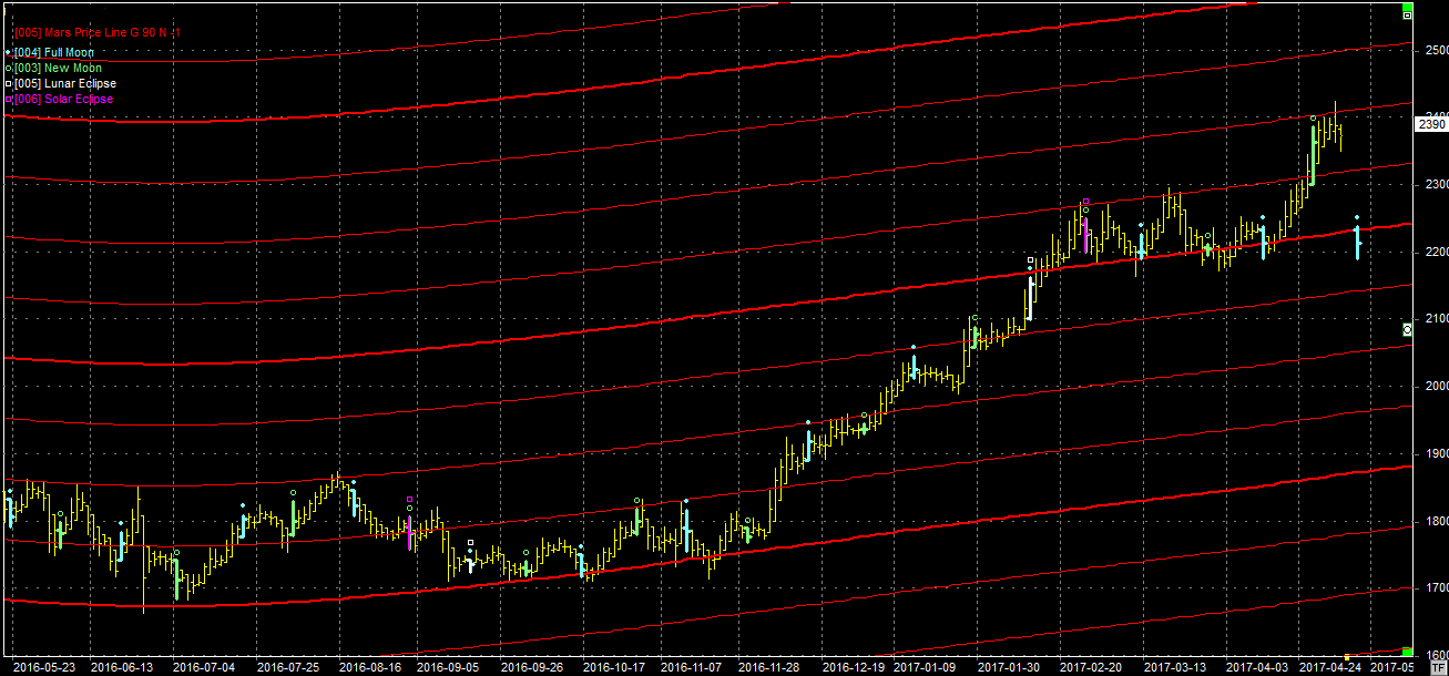 Na wykresie z liniami Marsa widzieliśmy kolejny, udany tym razem atak na linię położoną w okolicach 2300 pkt. Atak przeprowadzony na nowiu okazał się pełnym sukcesem byków. Obecnie kurs dotarł już do kolejnego oporu, położonego 100 pkt. wyżej. Wg mnie rynek powinien odpocząć po takim wzroście. Zakładam więc korektę lub horyzont w nadchodzącym tygodniu.