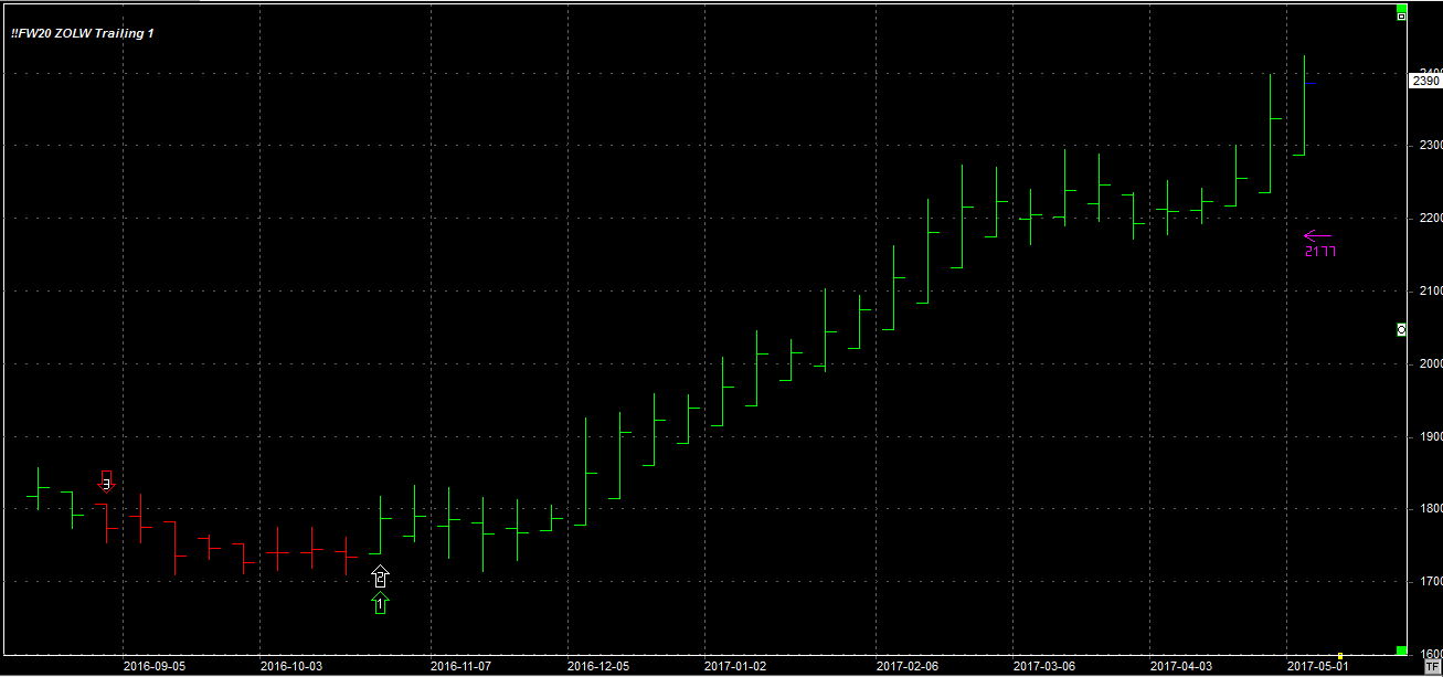 Tydzień zamknął się na poziomie 2390 pkt., 16 pkt. wyżej niż tydzień temu. System utrzymuje pozycję długą 1 szt. po 1817 pkt. Stop dla pozycji 2177 pkt.