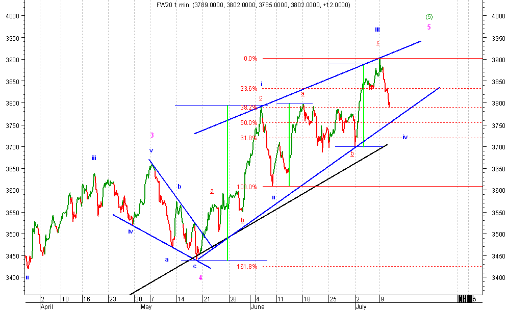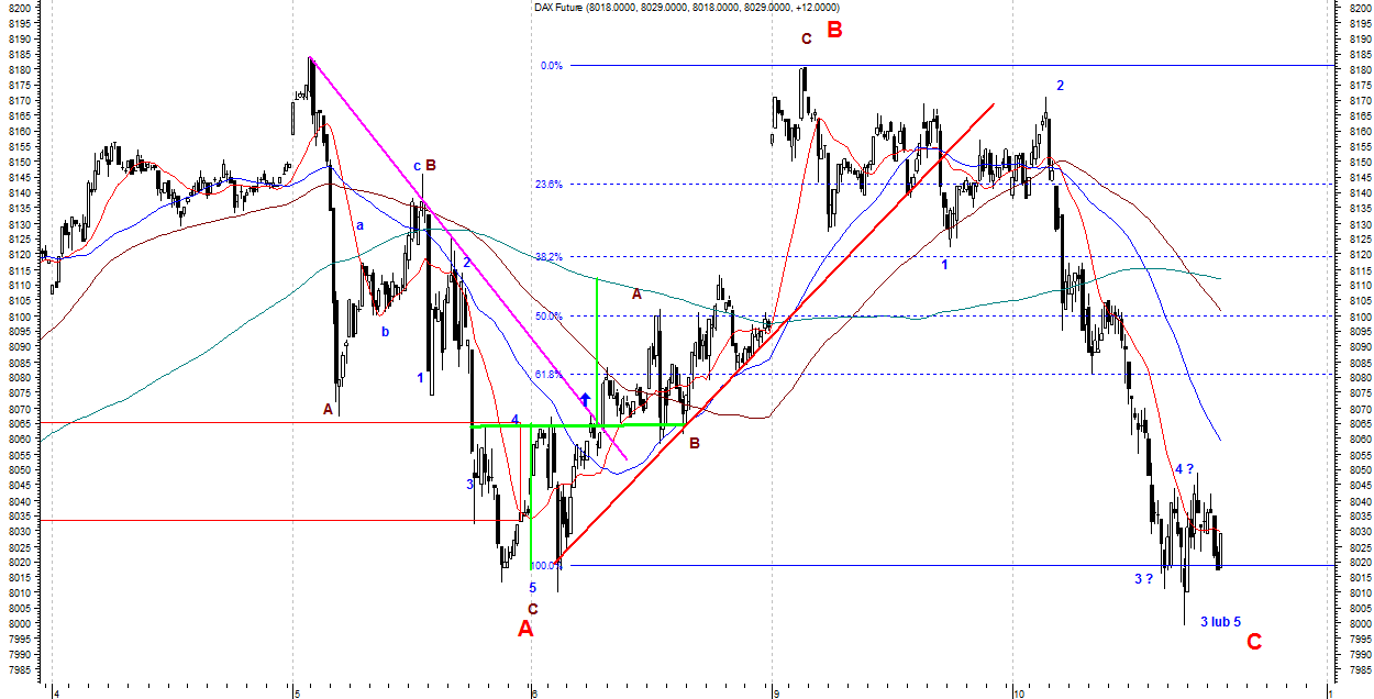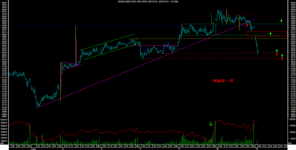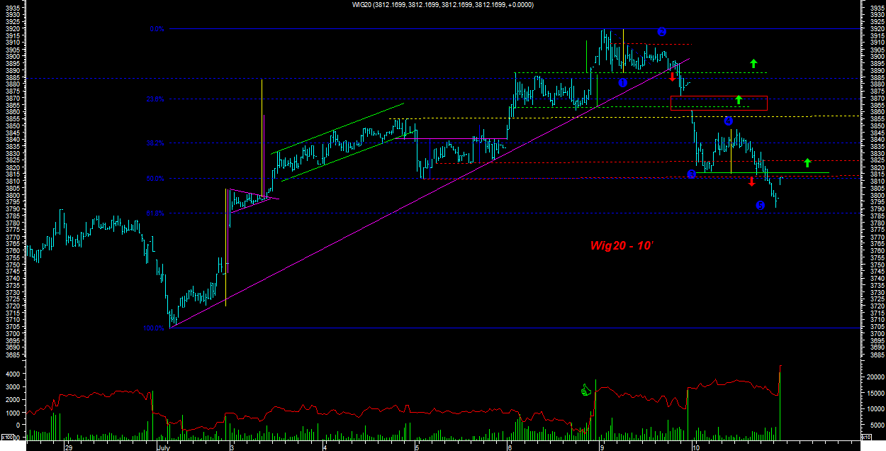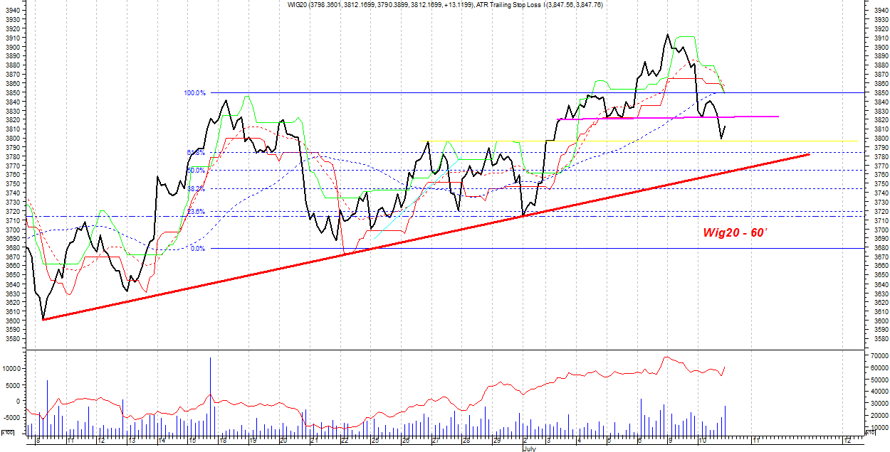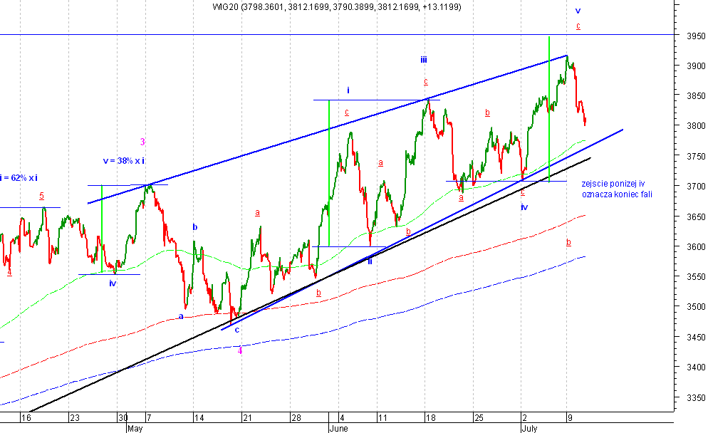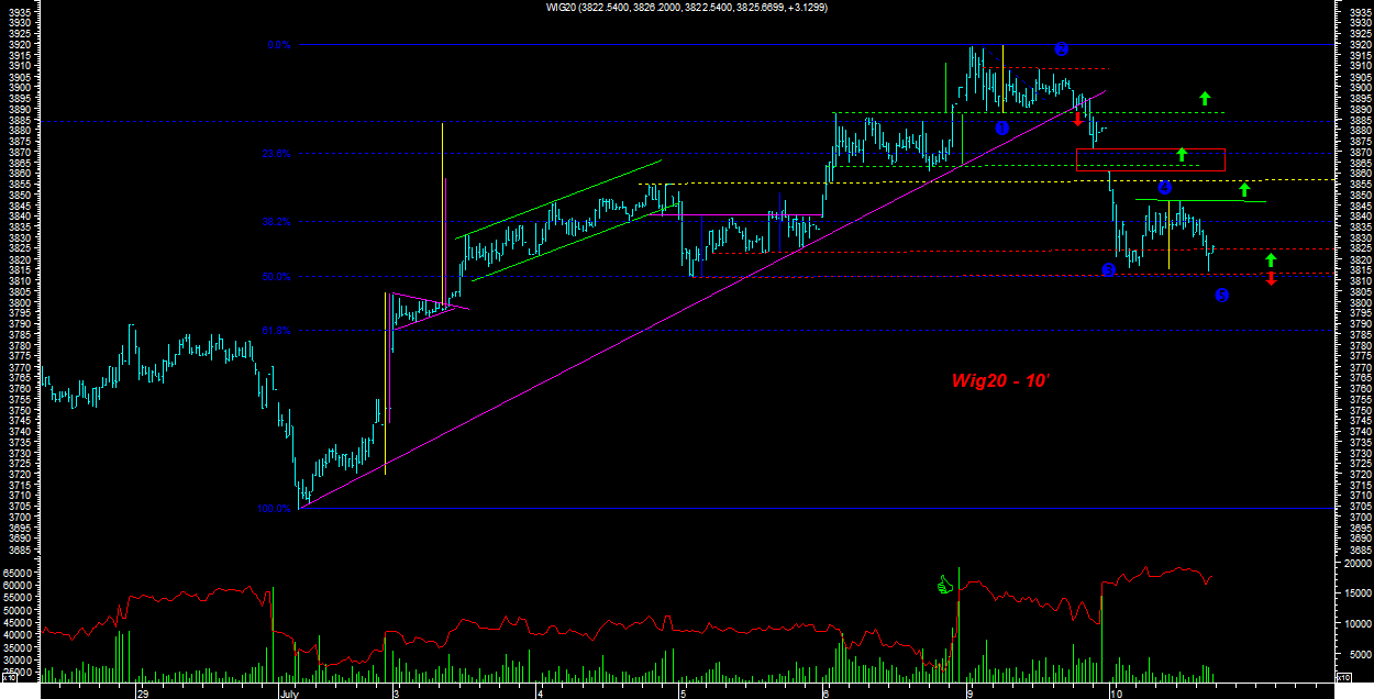 indeks doszed? do wsparcia wyznaczonego do?kiem z 5.07 i zniesieniem 50% poprzedniej fali wzrostowej. Na wykresie utworzy?a siŕ pi?tka (gdzie 1=5) co mo?e skutkowaŠ korekcyjnym odbiciem. Prze?amanie minimum to test kolejnego zniesienia z mo?liwym uformowaniem wiŕkszej rgr.