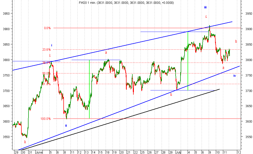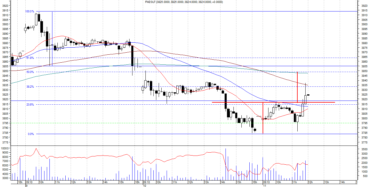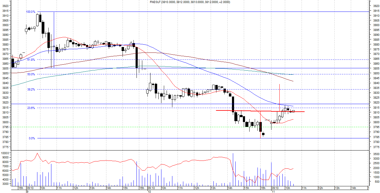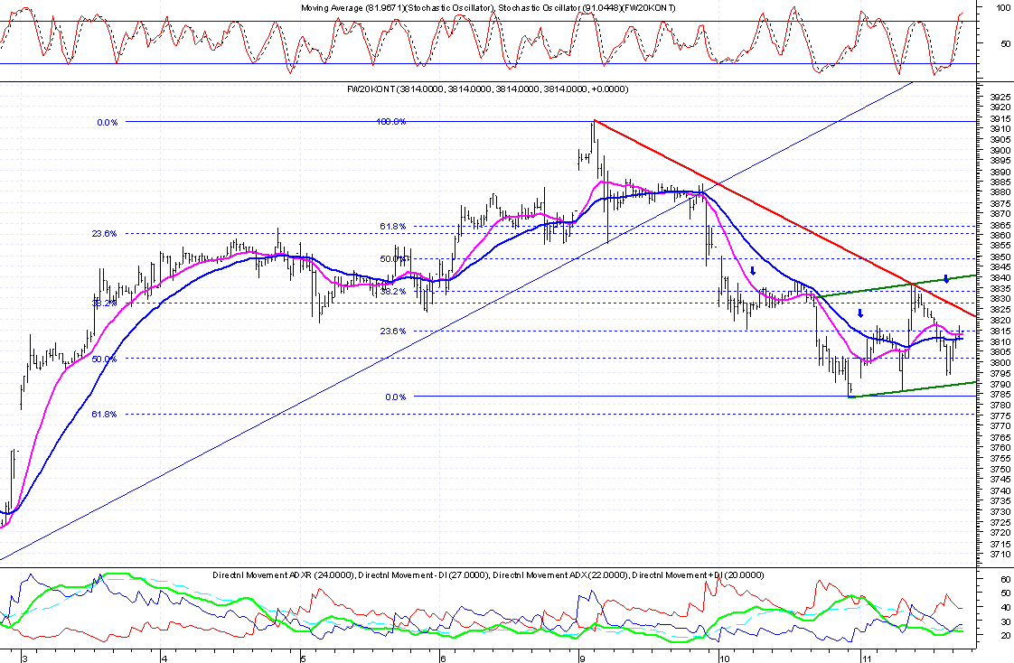 wspomniany wczeÂniej poziom zosta? osi?gniŕty pomimo za?amania orgr, gdyz byki dosta?y kolejn? szansŕ tworz?c podwˇjne dno. na poziomie 3816-3840 mozliwa jest konsolidacja, poziom obrony poni?ej.