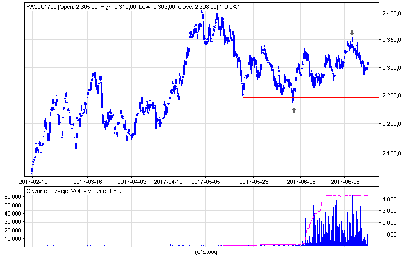 Jak widać na wykresie wsparcia i opory od dłuższego czasu bez zmian – wyjście poza 2250 –2350 powinno pokazać kierunek. Uwaga na fałszywki takie jak dwie ostatnie.