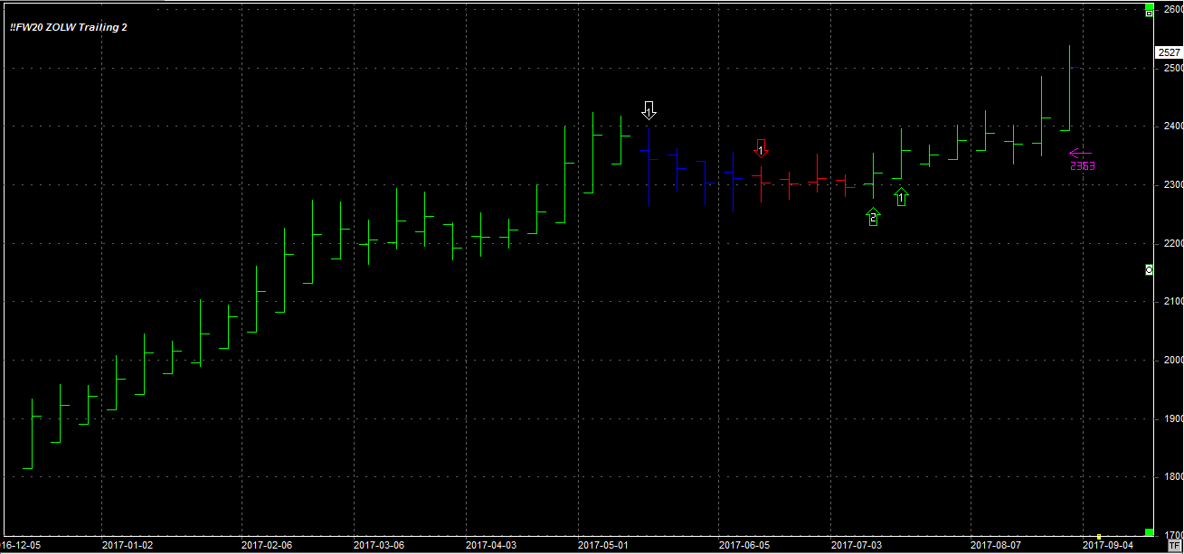 Tydzień zamknął się na poziomie 2527 pkt., 49 pkt. wyżej niż tydzień temu. System utrzymuje 2 długie pozycje po 2349 pkt. (średnia z dwóch transakcji). Stop dla pozycji 2363 pkt.