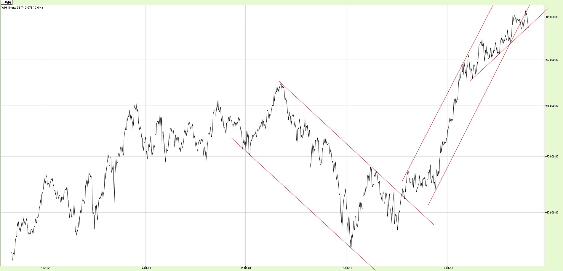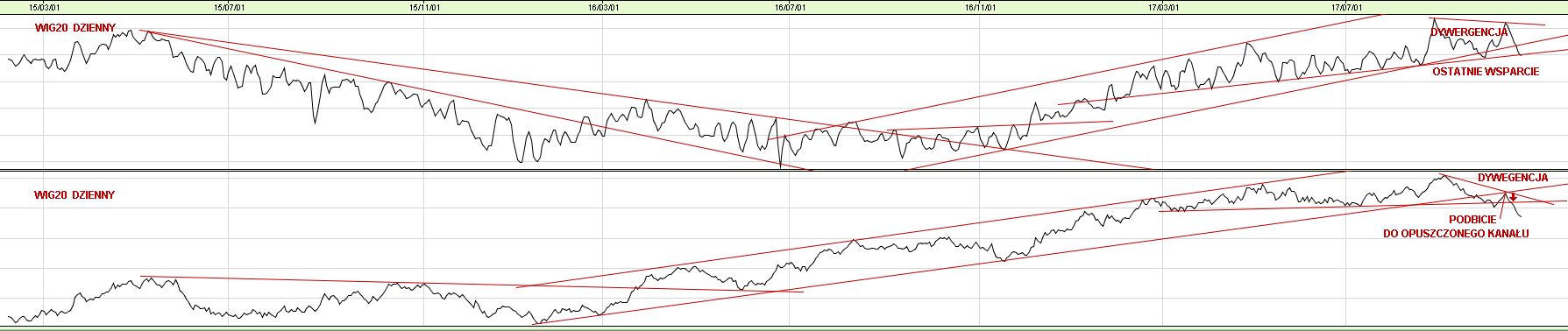 WIG zrobił już też ruch powrotny do wybitego dołem kanału hossy (dobre miejsce na sprzedaż) i teraz ma do pokonania jeszcze tylko jedno wsparcie przed solidniejszymi spadkami:
