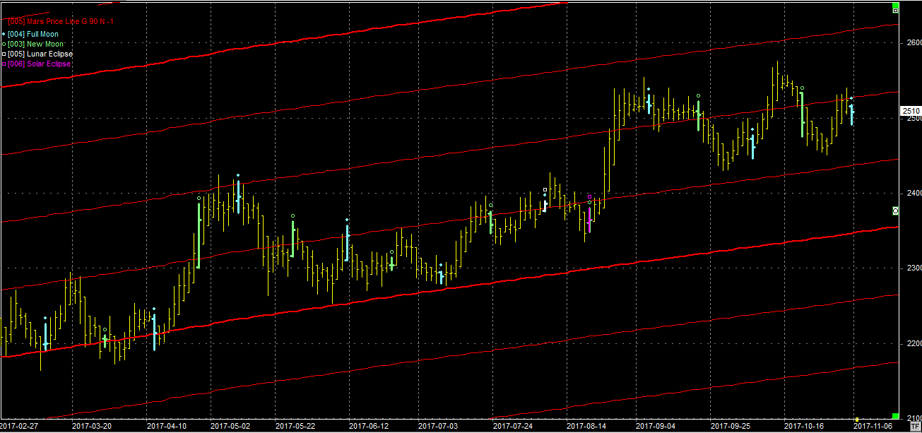 Na wykresie z liniami Marsa widzimy kolejny atak na opór położony na linii na poziomie 2510 pkt. Wynik walki na razie jest remisowy ale jeśli byki wykaż więcej determinacji to opór polegnie. Pomagać może sobotnia pełnia, która mogła wyznaczyć koniec spadkowej korekty, jaką obserwujemy od początku tygodnia.