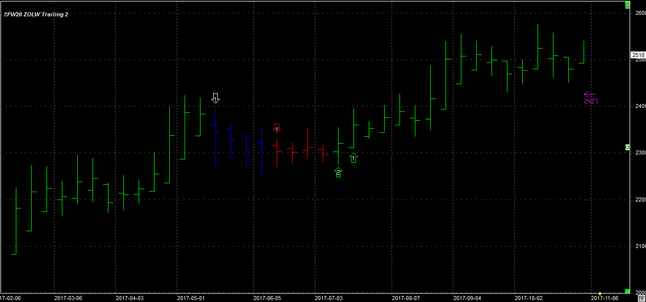 Tydzień zamknął się na poziomie 2510 pkt. , 11 pkt. wyżej niż tydzień temu. System utrzymuje 2 długie pozycje po 2349 pkt. (średnia z dwóch transakcji). Stop dla pozycji 2427 pkt.
