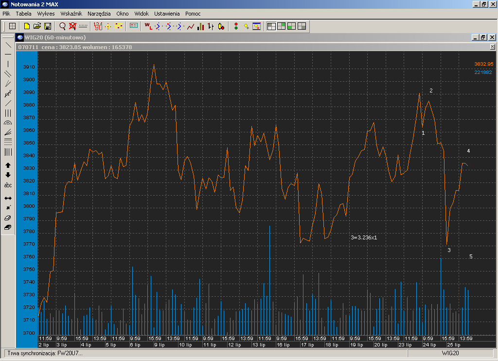 Pierwsza jest taka, ?e ostatni szczyt na 3890 na indeksie to koniec fali v. W takim wypadku fala v by?aby fal? nazwan? przez Neely'ego "terminal impuls". Jest to mozliwie gdy? to podejÂcie znios?o ponad 75% fali iv a to jest warunek aby tak? falŕ zakwalifikowaŠ jako "terminal impuls".