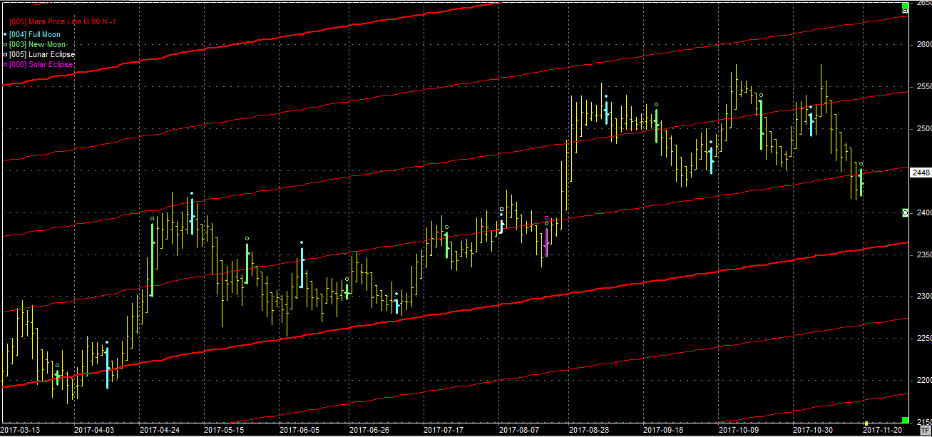 Na wykresie z liniami Marsa trzeci atak na opór na poziomie położonym obecnie w okolicach 2520 pkt. nie udał się. Może to utworzyć formację potrójnego szczytu, na którą trzeba uważać. Do momentu zejścia poniżej linii Marsa na poziomie 2450 pkt. możliwy jest jednak kolejny atak na opór. Przebicie tego poziomu w dół to realizacja formacji odwrócenia. 18.11.17 mamy nów.