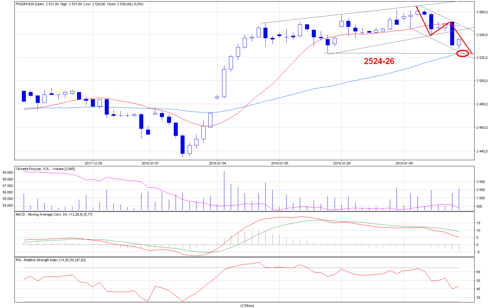 Mamy zastopowanie hozzzy. Jak widac na wykresie wygrzebało się dołem z klina i obecnie poziom 2524 wydaje się być kluczowy dla dalszych ruchów intra – mina jako podstawa klina , sk45, równośc c=a, kanał spadkowy.