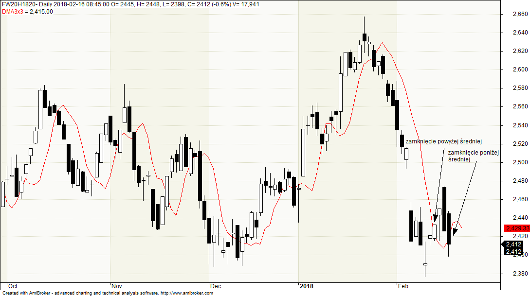 Widzimy te duże spadki w ciągu dwóch ostatnich tygodni a potem co interesujące formowanie się formacji tzw. "Podwójnego powrotu " Dinapolego. Warunkiem uformowania się tej formacji na gwałtowną zwyżkę kursu jest zamkniecie się dziennej świecy powyżej średniej co miało już miejsce i zaznaczyłem to na wykresie (i te zamknięcie musi być poprzedzone gwałtownymi spadkami), potem spadek i zamkniecie się dziennej świecy poniżej średniej co też zaznaczyłem na wykresie oraz ponowne zamkniecie się świecy powyżej tej średniej co jeszcze nie miało miejsca. Czekam aż dzienna świeca zamknie się powyżej średniej Dinapolego, wtedy będzie to sygnał kupna. Aby formacja była ważna, to zamknięcie się świecy powyżej średniej powinno nastąpić w ciągu paru najbliższych dni, może jutro albo pojutrze? Wtedy zgodnie z teorią należy kupować. Na razie czekam bez pozycji.