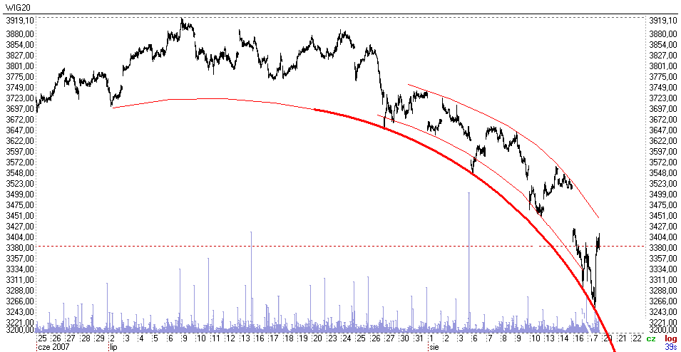 Na wig20 mo?na spodziewac siŕ odbicia, ktˇre jednak bŕdzie tylko korekcyjn? fal? b lub 4 w a, ktˇre po wiŕkszym lub mniejszym odbiciu gro?? jeszcze jednym testem do?ka(Wig20-line ). Powrˇt do rekordˇw raczej niemo?liwy jest bez wiŕkszej konsolidacji. Nadziejŕ dla rynku w d?u?szej perspektywie daje natomiast fakt, ?e obecny spadek trwa podobnie jak ubieg?oroczny majowy 6 tygodni, natomiast jego skala jest na razie mniejsza (Wig20-weekly ). Sytuacjŕ zdecydowanie by poprawi?o "wymalowanie" jakiej formacji odwrotu na weekly.