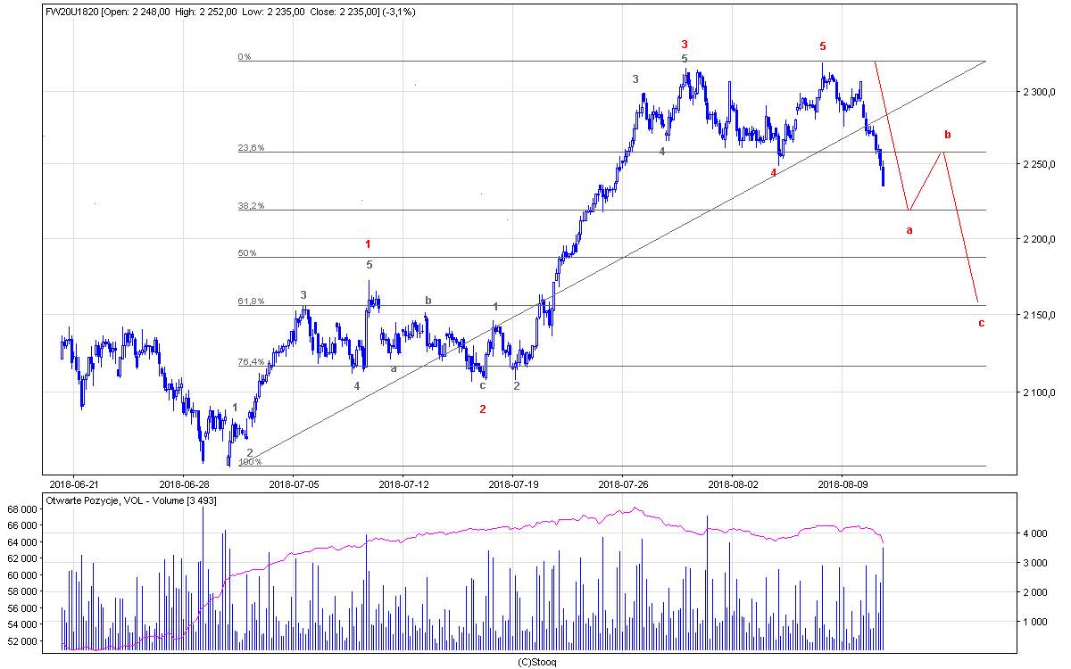 Piątkowa świeczka nie pozostawia wątpliwości, że należy się chwila oddechu. Skoro 5 w górę za nami (jak widać na załączonym wykresie) to czas na wspomniany oddech - interesująca będzie struktura obecnej korekty (jak na razie na spadkowym lopie) i obserwacja zachowania rynku przy potencjalnych wsparciach.