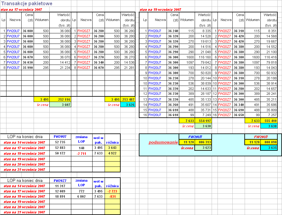 Dzisiejsze Ârednie ceny transakcji to 3630 na U i 3638 na Z, natomiast srednia cena z uwzglŕdnieniem wczorajszych pakietˇw to odpowiednio 3623 i 3635.
