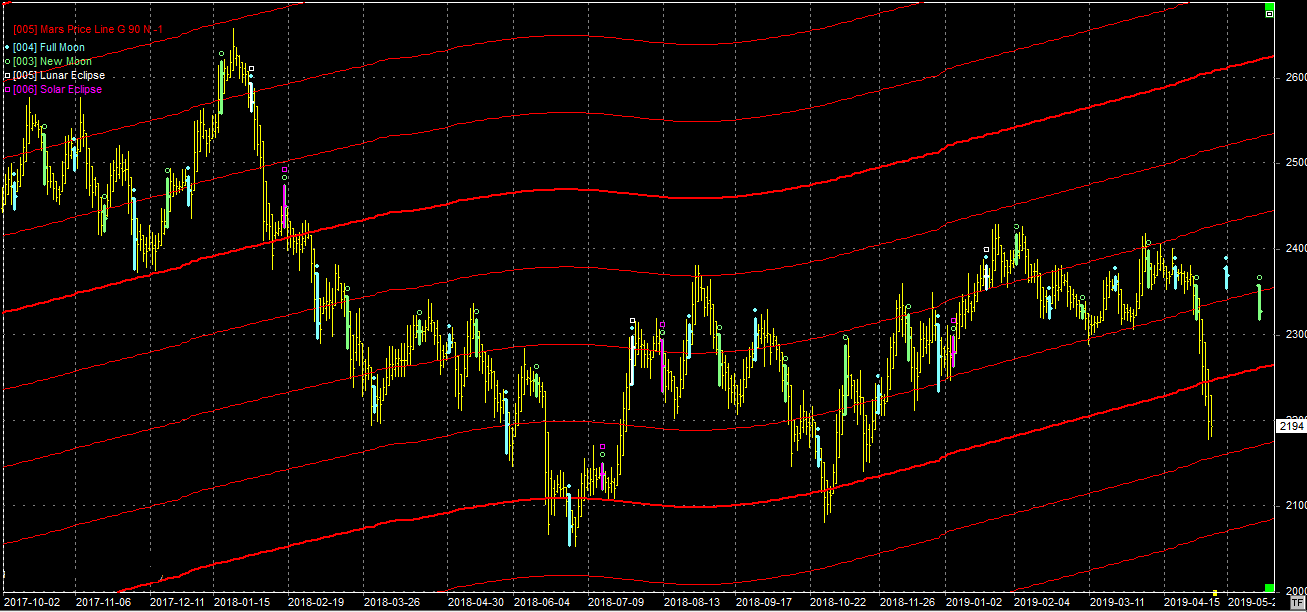 Na wykresie z liniami Marsa widzimy zejście do wsparcia na poziomie 2330 pkt. Jest ono obecnie testowane, ale jeszcze nie definitywnie przełamane. Naruszenie w skróconym, świątecznym tygodniu zignorowałbym. Rzeczywistą kondycję byków poznamy dopiero w nadchodzącym tygodniu. Jeśli wsparcie padnie to czeka nas ruch w okolice kolejnego wsparcia, obecnie na poziomie 2250 pkt. Opór na poziomie 2440 pkt. Odwrócenie tendencji może prowokować niedzielny nów (05.05.2019).