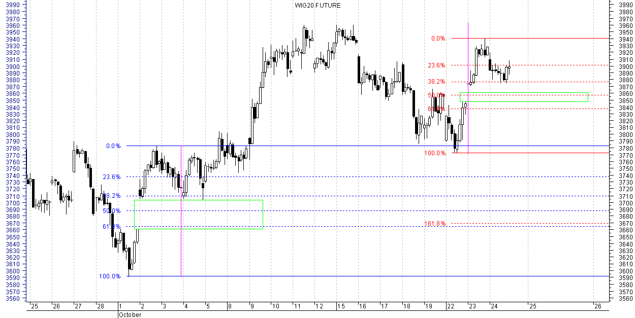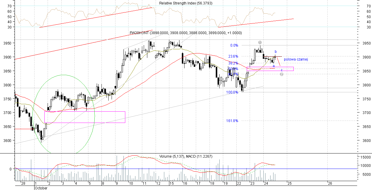 Po 168pkt wzrostu, przyszedł czas na korektę. Na intra powolutku chłodzą sie wskaźniki jeszcze powolniejszym spadkiem (aby czasami kogoś nie uszkodzić :) ). Co niektórzy wyobrażali sobie co chwila ataki na szczyty, ale zagrywka była typowa na "wyleszczenie" mało doświadczonych graczy. Wysokie cienie, małe korpusy i tak 4 godziny. W końcówce pojawił się atak (my chojraki bo przed danymi zaczeliśmy już szaleć :) ), który zakończył się szybkim wybiciem na 3908pkt. Ten lokalny szczyt może okazać się falką b w korekcie abc, tzn. że czeka nas jeszcze prawdopodobnie falka c w 2.