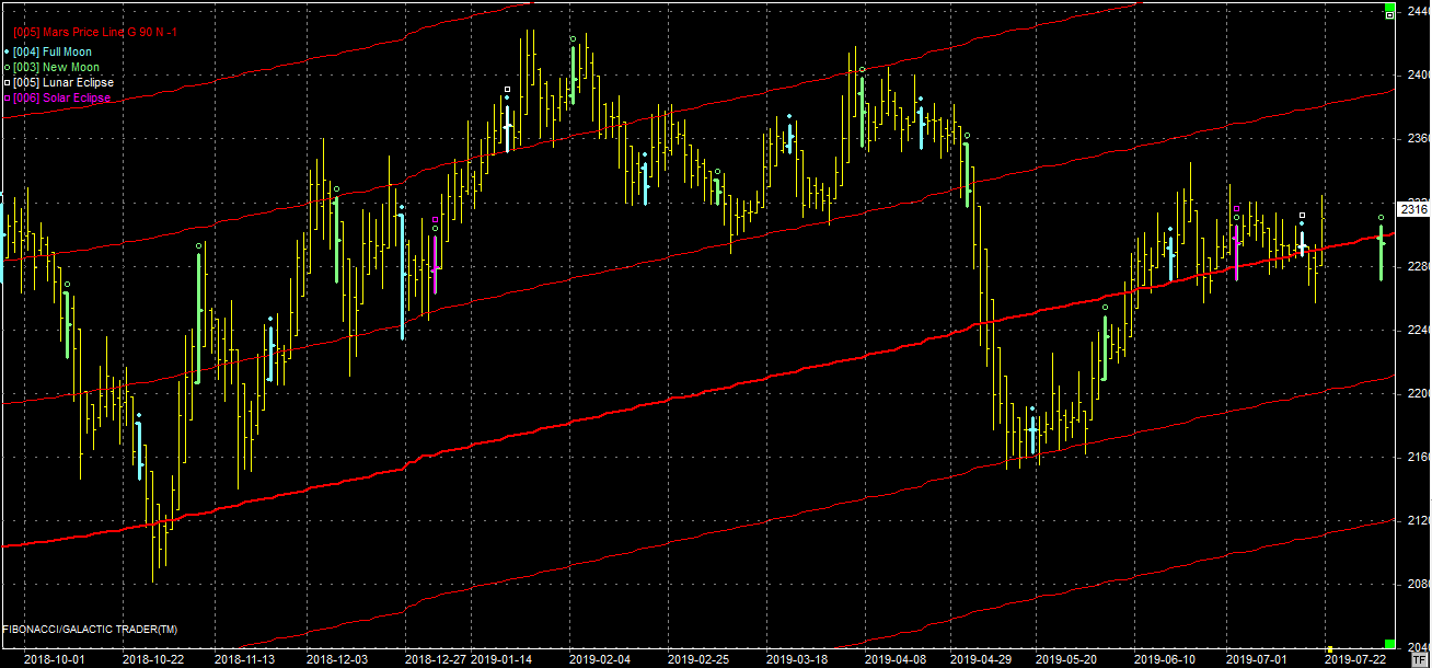 Na wykresie z liniami Marsa byki ponownie muszą bronić linii na poziomie 2290 pkt. Jej przełamanie grozi spadkiem o minimum 100 pkt. Pomocna w zmianie tendencji może być wtorkowa pełnia na zaćmieniu Księżyca. To może być dzień solidnego ruchu trendowego. Kierunek jak to zazwyczaj bywa z aspektami nieznany. Trzeba się podłączać pod pociąg, jak ten już jedzie.