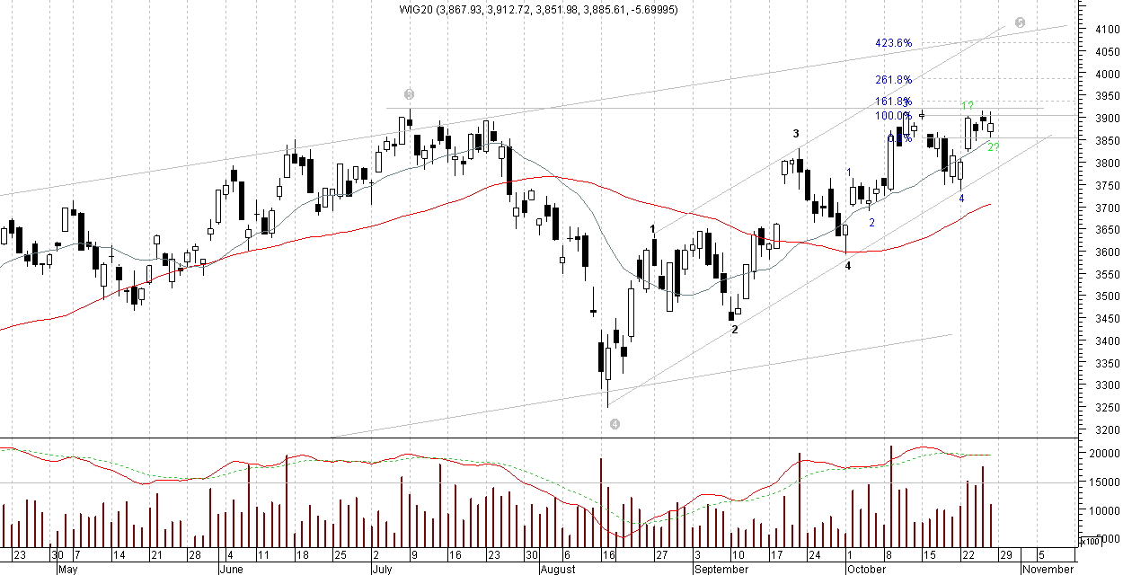 gdy ostatni raz pokazywałem ten rysunek widziałem 5 fal up impulsu od sierpnia br (widoczne na rysunku) potem korekta (bardzo uboga) po niej powinna nastąpić 5-ka, widać kształt klina....