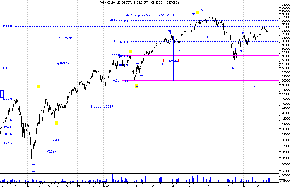 pozwolę sobie przypomnieć swój ulubiony rysunek z falkami od padaki z maja 2006, rysunek zakłada ze zrobiliśmy 5 falek (zółte numerki), argumentacja za takimi zasięgami na rysunku, zgodnie z tym założeniem możemy spodziewać sie korekty ABC, poprzedni raz rysunek pokazywałem gdzieś we wrześniu, czyli w trakcie kształtowania B, jej zasięg pokazuje niebieska linia, ta najbardziej z prawej, jak widać zasięg został zrealizowany, ten zasięg wynikał z założenia, że korekta nie zejdzie poniżej żółtej czwórki i będziemy mieli do czynienia z prosta korektą ABC, gdzie A=C, pod to założenie można teraz spróbować oznaczyć fale w B