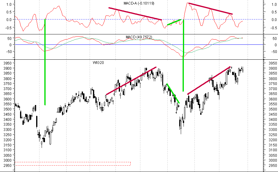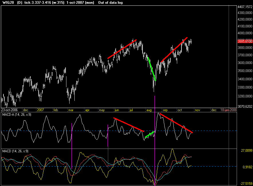 Jednak odnoszę wrazenie, że już ta forma nieco wyprzedza MACD przejściami przez zero oraz dodatkowo pokazuje inne dywergencje.