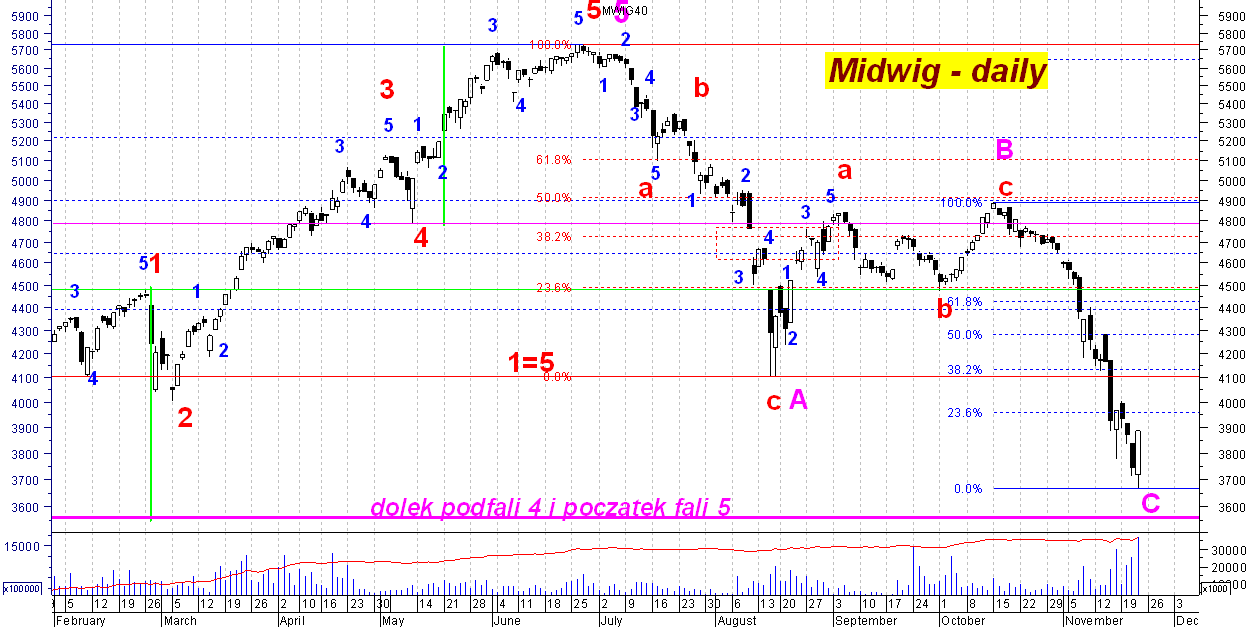 Male spolki natomiast dostaly szanse wyjscia z impasu. Na wiekszosci powstaly dzis poztywne formacje objecia hossy (wymagajace jeszcze potwierdzenia). Natomiast najwazniejsza rzecza jest to, ze drastyczna zmiana nastrojow powinna zachamowac czasowo proces umarzania jednostek. Ponadto mwig40 spadl juz prawie do podfali 4 wyzszego rzedu, czyli teoretycznie zasieg spadku prawie zrealizowal (w wariancie, ze spadki od lipca to tylko korekta ABC). Natomiast poki co, nie nalezy sie spodziewac powrotu do trwalych wzrostow. Najbardziej prawdopobne jest odbicie po ktorym nastapi konsolidacja lub lekki trend spadkowy (z mozliwym testowaniem dolka). W zalaczeniu mwig, reszta wykresow w weekend.