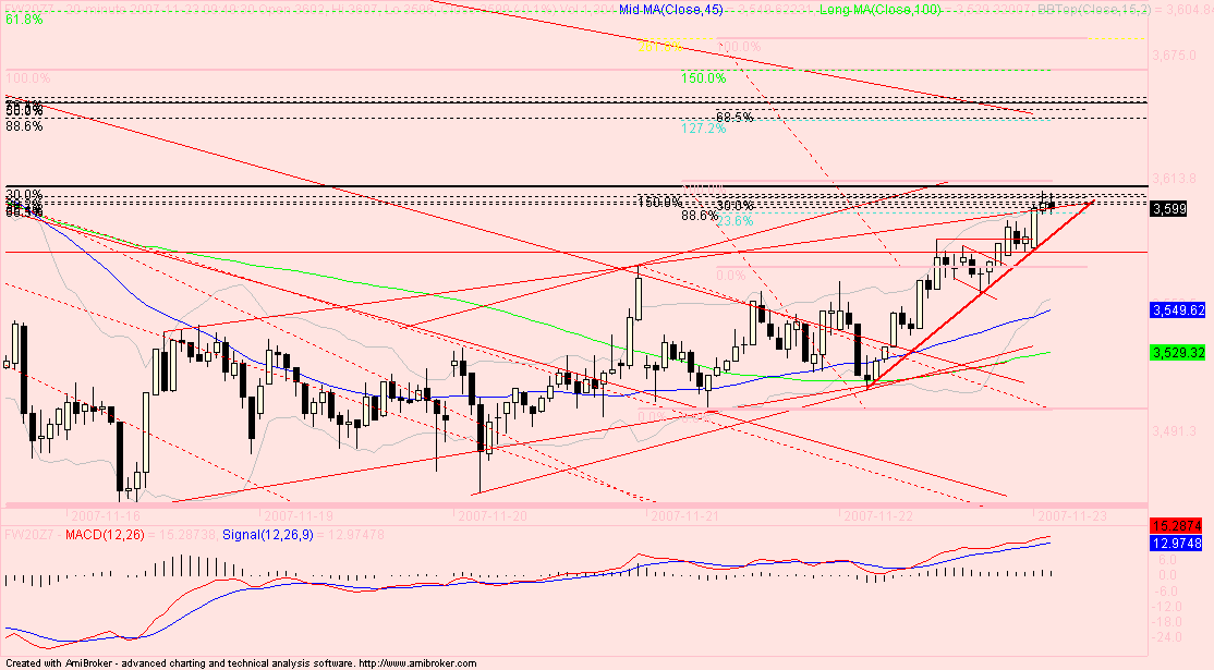 Dodam tu, że czas (3.XII) pochodzi z cyklu i aproksymacji paraboli spadkowej (zielona przerywana, niebieskie pionowe), poziom ~3250 z aproksymacji nieliniowego wsparcia od 2006r (gruba żółta przerywana), podane poziomy negacji koncepcji to 38, 50 i 62% zakresu od maksa 27.X.2007 do minimum 16.XI.2007 ponieważ zakładam, że z największym prawdopodobieństwem obecnie jest realizowana fala B w spadku ew. łącznik w 5-3-5: