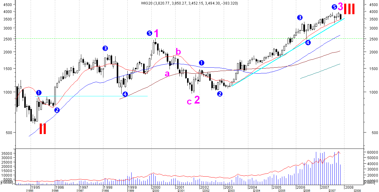 Patrząc na wykres W20 monthly wygląda na to że jesteśmy w fali różowe 4 i obecnie kreślimy falę A. Raz jeszcze wkleję to co naskrobałem kiedyś: "Analizując wykres WIG20monthly wygląda że korekcyjna 2 (w III) miała charakter zygzaka. Zatem wychodząc z reguły zmienności teraz powinniśmy się spodziewać korekty płaskiej zwłaszcza iż 3 w III była wydłużona. Korekta ta powinna być rozszerzona (nieregularna) lub też przybierze formę trójkąta"