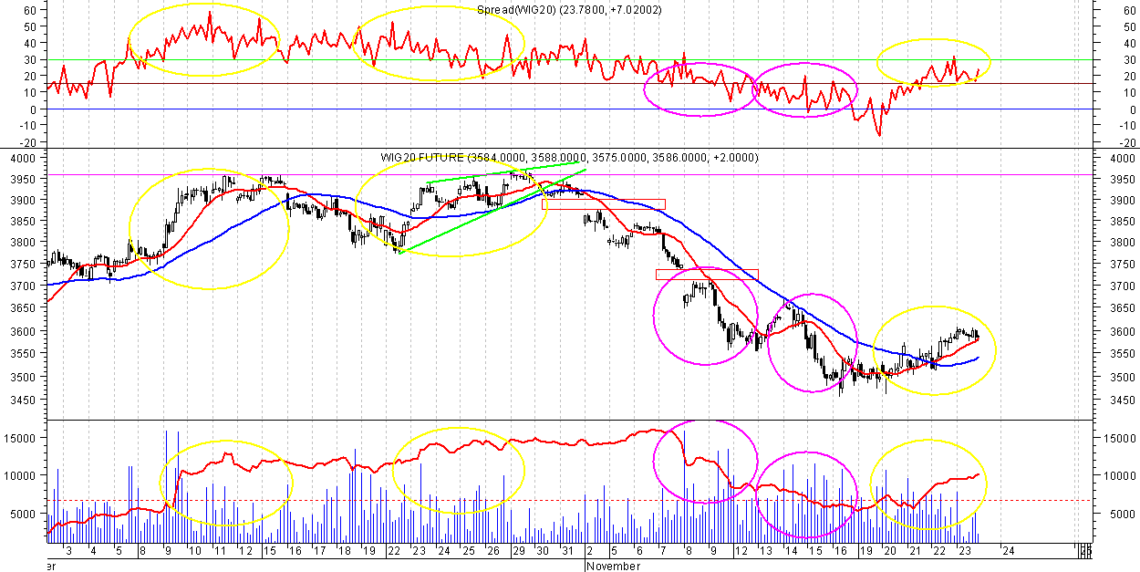 nie wiem co uznajesz za szczyt fali 1 - gorke z lipca czy pazdziernika. Chociaz obecnie obowiazujaca pozycja to L, to moim zdaniem nadal istnieje obawa, ze spadki (na WIG20) jeszcze sie nie skonczyly. Zagrozeniem sa przede wszystkim otwarte ponownie pozycje arbitrazowe, ktore do 21 grudnia powinny byc zamkniete. Pisze "powinny" a nie "musza", gdyz istnieje jeszcze mozliwosc zrolowania posiadaych przez arbitrazystow kontraktow na nastepna serie, jednak w tym przypadku warunkiem jest znalezienie partnera, ktory zechce otworzyc L na nowej serii. Oprocz poprzedniego kwartalu, wczesniej (odkad na futach uaktywnili sie arbitrazysci) zawsze tak bywalo. Jednak w ubieglym kwartale rolowania nie bylo, co jak sie okazalo, slusznie zapowiadalo zmiane nastawienia do rynku przez zarzadzajacych.