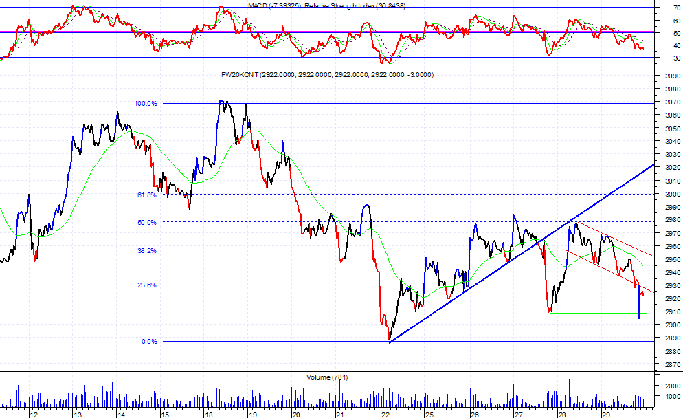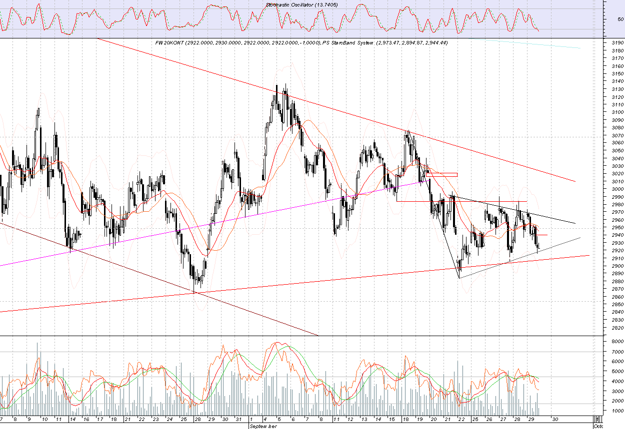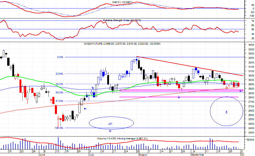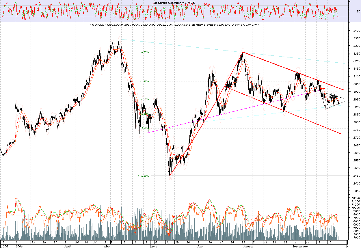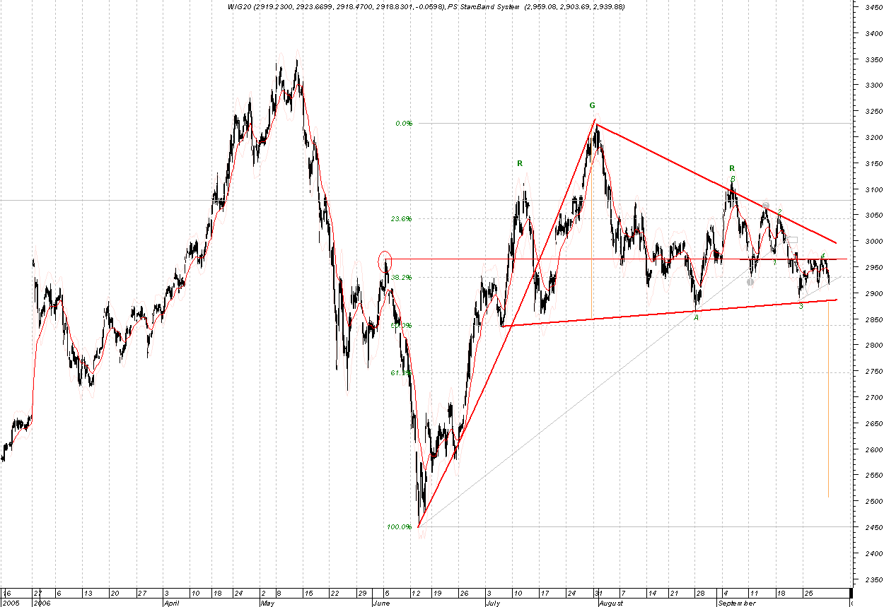 druga formacja, ktora jest w trakcie tworzenia wyjasnialaby branie esek.FLAGA tez jest formacja kontynuacji, ktora ogranicza spadek w krotkim terminie do ok.2700pkt. zeby ta formacja byla wiarygodna, powinno nastapic przynajmniej jeszcze jedno zejscie do dolnej lini ograniczenia.