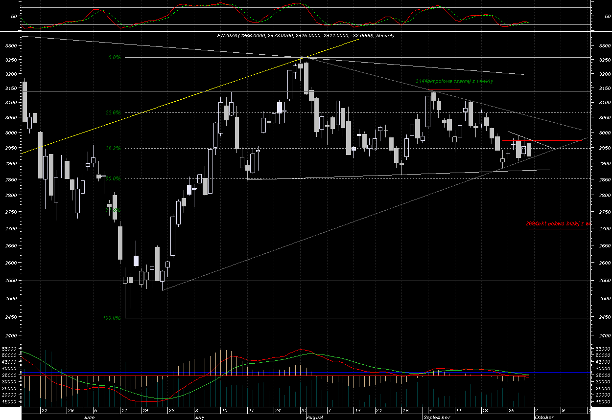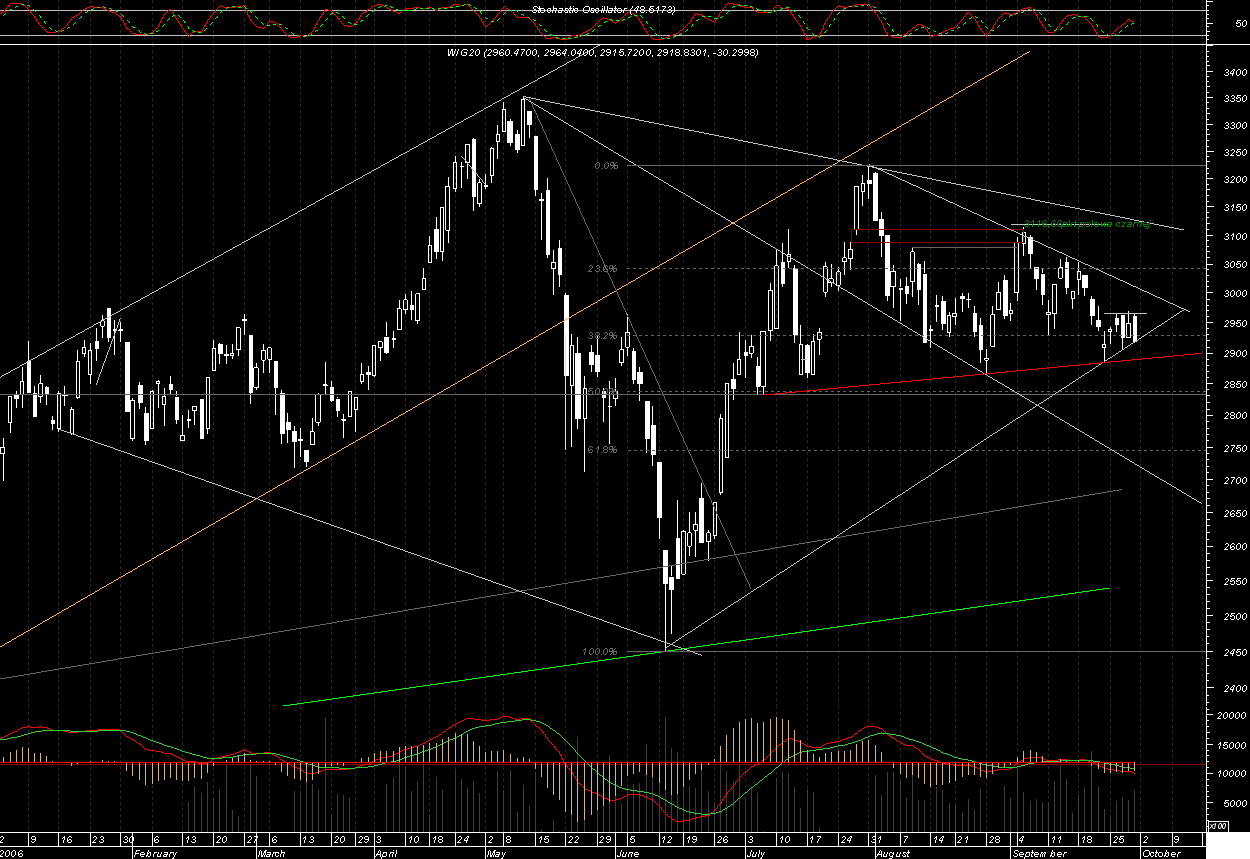Naw20 oraz kontrakcie FW mozna zauwazyc gigantyczna choragiewke, ktora (wg. definicji : jest formacja kontynuacji trendu.) w tym przypadku trend jest wzrostowy od 2445pkt i wyjscie z niej musialoby nastapic gora.