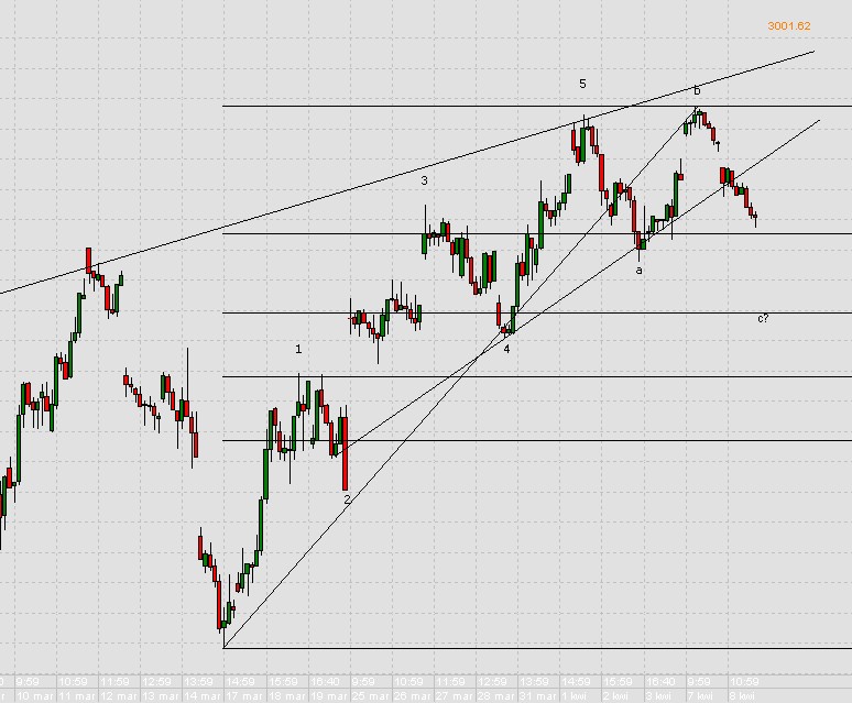 jesteśmy imo na rozdrożu - obrona poziomu 2980 (jutrzejsza wartość pokonanej ostatnio linii trendu spadkowego zatem możliwe wsparcie i prawdopodobna jutro wartość 27EMA) - będzie sygnałem L z możliwym wzrostem do 3080,, jego pokonanie to spadek w okolice 2930