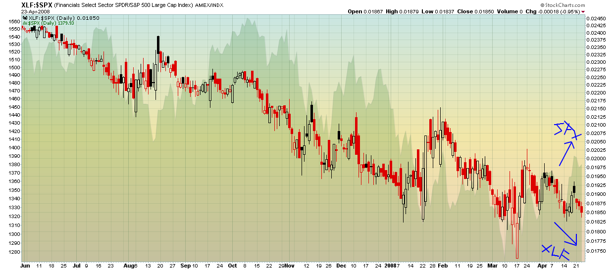 czy ruchy w gore (USA) moga byc utrzymane bez aktywnego udzialu spolek sektora finansowego (xlf)? w tle: SPX, swieczki: wspolczynnik XLF do SPX.